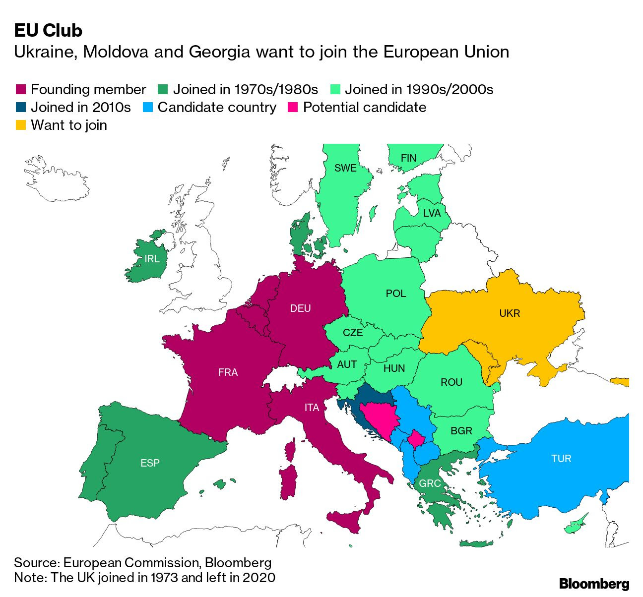 La decidida resistencia de Ucrania a la invasión de Rusia aceleró la aceptación de sus ambiciones de la UE en Bruselas. Moldavia también aprovechó el momento para defender su caso, al igual que Georgia, que libró una breve guerra con Rusia en 2008.