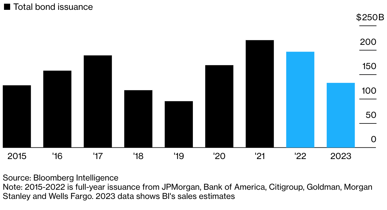 De hecho, se espera que los seis bancos más grandes de Wall Street reduzcan su emisión de bonos corporativos en 2023 por segundo año consecutivo. Bloomberg Intelligence estima que el grupo podría vender un total de $ 20 mil millones a $ 25 mil millones este mes después de publicar los resultados, una caída del 15% con respecto al año pasado. Y para todo el año, las ventas podrían caer un 33% a $132 mil millones.