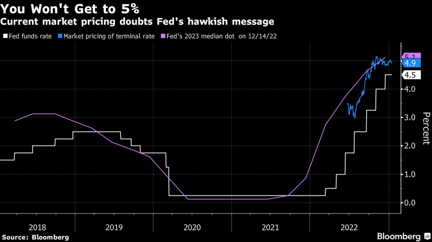Los rendimientos del Tesoro a corto plazo se desplomaron el jueves a raíz de una lectura del 6,5% de los precios al consumidor de diciembre año tras año, por debajo del máximo del 9,1% en junio, y los mercados de swaps ahora cotizan en una tasa máxima de la Fed del 4,9%. Eso está fuera de sintonía con las proyecciones de los responsables políticos de un destino superior al 5%, lo que fue reiterado por el presidente de la Fed de St. Louis, James Bullard, después de los datos.