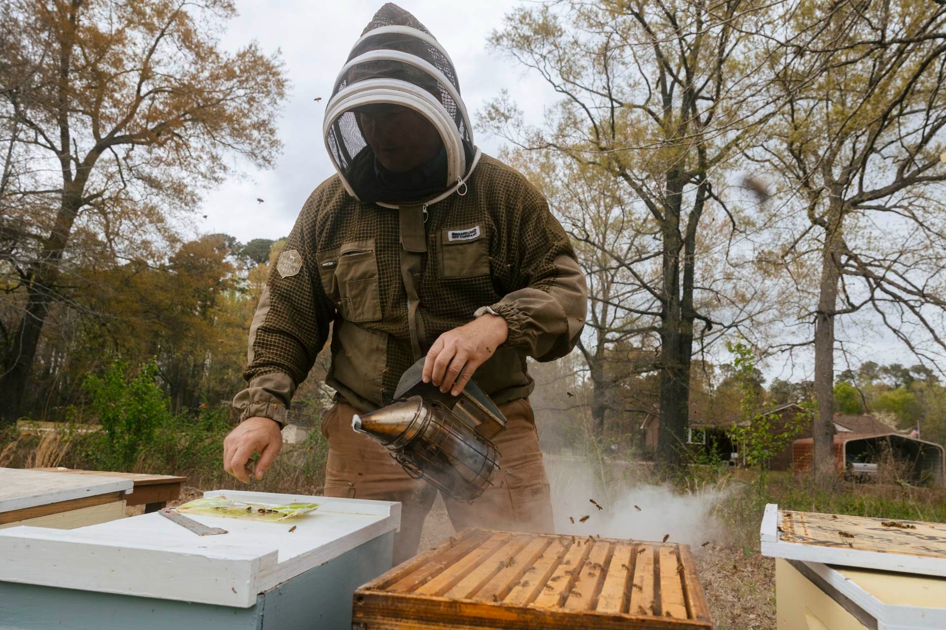 Cosechar de sus colmenas, que actualmente suman 62, y cultivar las flores que necesitan las abejas le ayudó a mitigar su estrés postraumático. Así que llegó a un acuerdo con su esposa: se encargaría de la granja de miel, Secret Garden Bees, en Linden, Carolina del Norte, a tiempo completo, siempre y cuando no tuviera deudas.