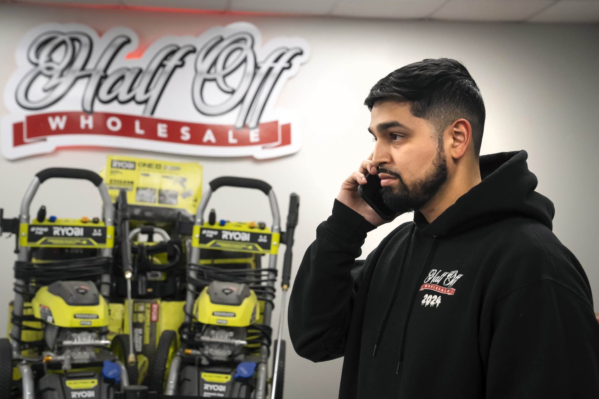 La empresa de Guzmán, Half-Off Wholesale, ofrece suministros para mejoras del hogar y equipos de jardinería al por mayor desde un almacén en las afueras de Atlanta. Los anuncios ofrecen grandes descuentos que resultan atractivos para los cazadores de ofertas: por ejemplo, $29 por un palé de herramientas eléctricas y cajas mixtas de mercancía devuelta de Amazon.com con una oferta inicial de tan solo $1.