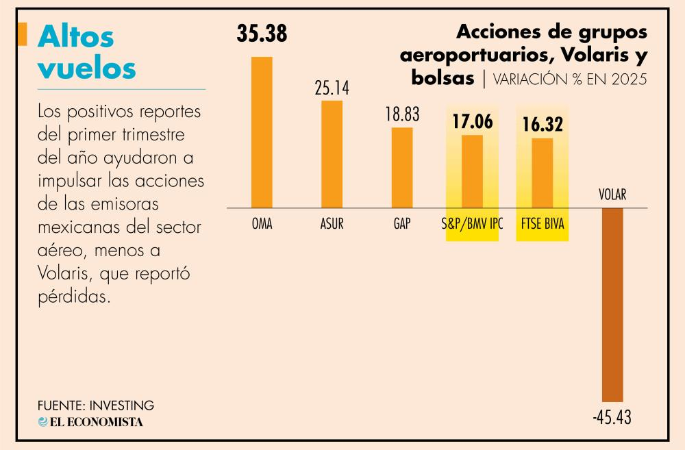 Las acciones de los tres grupos aeroportuarios que cotizan en la Bolsa Mexicana de Valores (BMV) registran un incremento de doble digito en 2025 e inclusive se encuentran en máximos históricos.