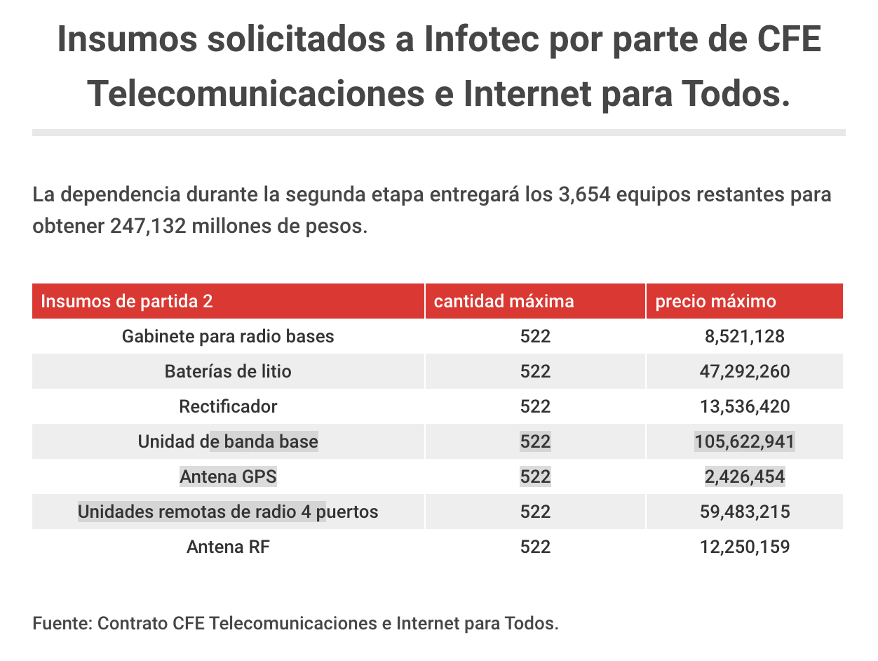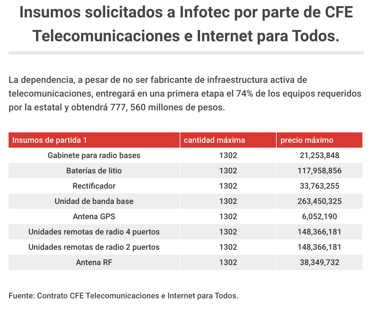 “Es posible que Infotec a través del outsourcing de personal, algo que ha aplicado desde la administración pasada, subcontrate la provisión de los insumos a un tercero para suministrar los materiales que solicitó CFE Telecomunicaciones e Internet para Todos, pero terciar la compra de insumos incurre en grandes sobre costos”, dijo la fuente.