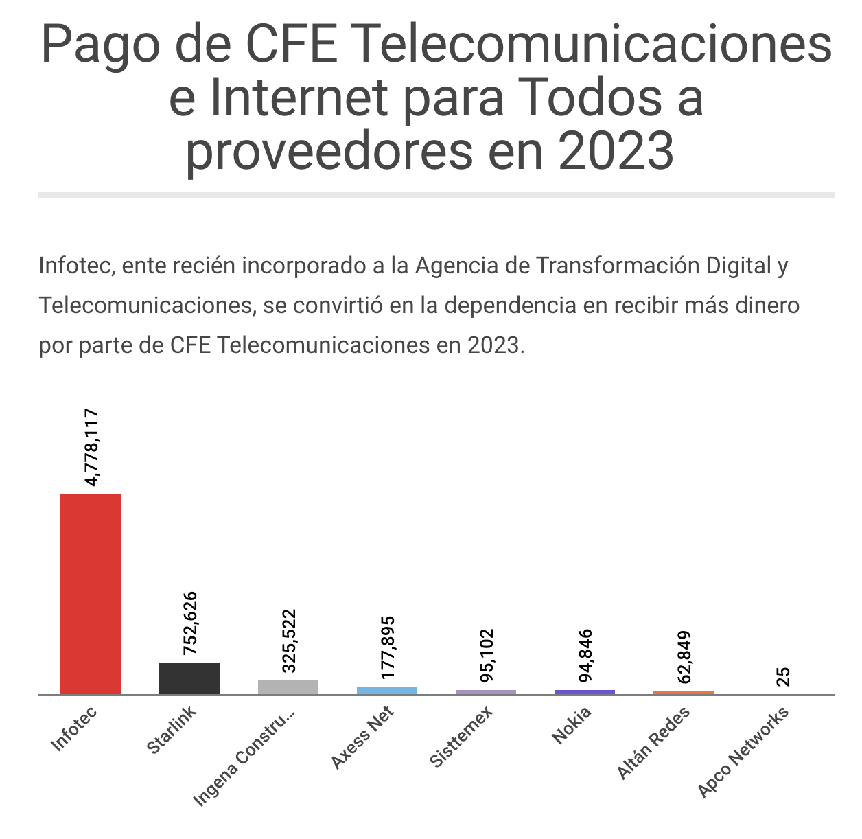 Infotec se ha convertido en el proveedor más costoso para CFE Telecomunicaciones e Internet para Todos. Sólo el año pasado la subsidiaria de la CFE pagó 4,778 millones de pesos a a esta dependencia, colocándose como la institución en recibir la mayor cantidad de dinero ese año, sólo por delante de Starlink, la empresa de Elon Musk, según datos obtenidos por Expansión mediante transparencia.