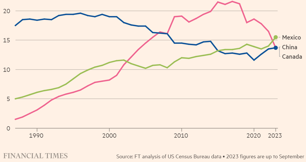 Trasladar la manufactura estadounidense a México no es nada nuevo. El proceso comenzó con el Tratado de Libre Comercio de América del Norte en 1994, que estimuló una ola de inversiones en el ensamblaje de automóviles, camiones y televisores. Las exportaciones de México a Estados Unidos superaron a las de China en la década de 1990, pero perdieron la corona cuando las importaciones chinas se dispararon. El cambio de este año se debe más a la marcada caída de las importaciones chinas que al auge de las exportaciones mexicanas.