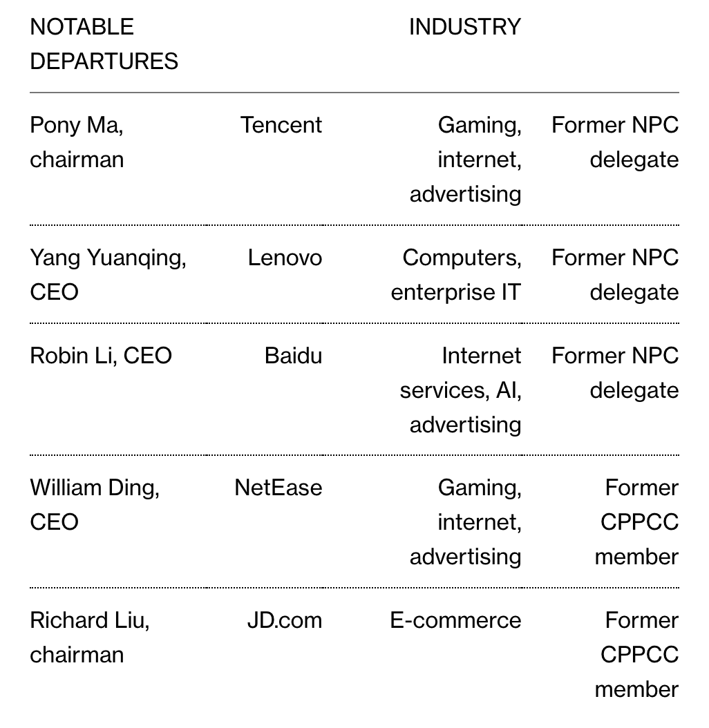 Los empresarios de Internet de renombre como el director ejecutivo de Baidu Inc., Robin Li, y el presidente de Tencent Holdings Ltd. desaparecieron de la lista de este año de participantes del Congreso Nacional del Pueblo y la CCPPCh, una ausencia notable que sugiere que Beijing no está lista para liberar al sector privado. después de librar una campaña de dos años para controlar a las empresas tecnológicas. En su tiempo en el órgano legislativo supremo de la nación, los dos hombres habían defendido políticas clave que Beijing luego adoptó, y su ausencia disminuirá la influencia de los actores de Internet de China en la dirección de políticas futuras.