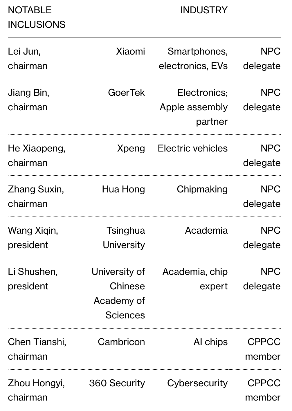Entre los que figuraban en la lista de NPC se encontraban figuras destacadas que encarnaban las aspiraciones de Xi en campos estratégicos, desde semiconductores y vehículos eléctricos hasta inteligencia artificial. Incluyeron a un experto en fichas que recientemente propuso formas de contrarrestar las sanciones de EE. UU.; el presidente de Xiaomi Corp. convertido en empresario de vehículos eléctricos, Lei Jun; y el presidente del fabricante de chips respaldado por el estado Hua Hong Semiconductor Ltd. El presidente del desarrollador de chips de inteligencia artificial Cambricon Technologies Corp., Chen Tianshi, asumirá un cargo en la CCPPCh.